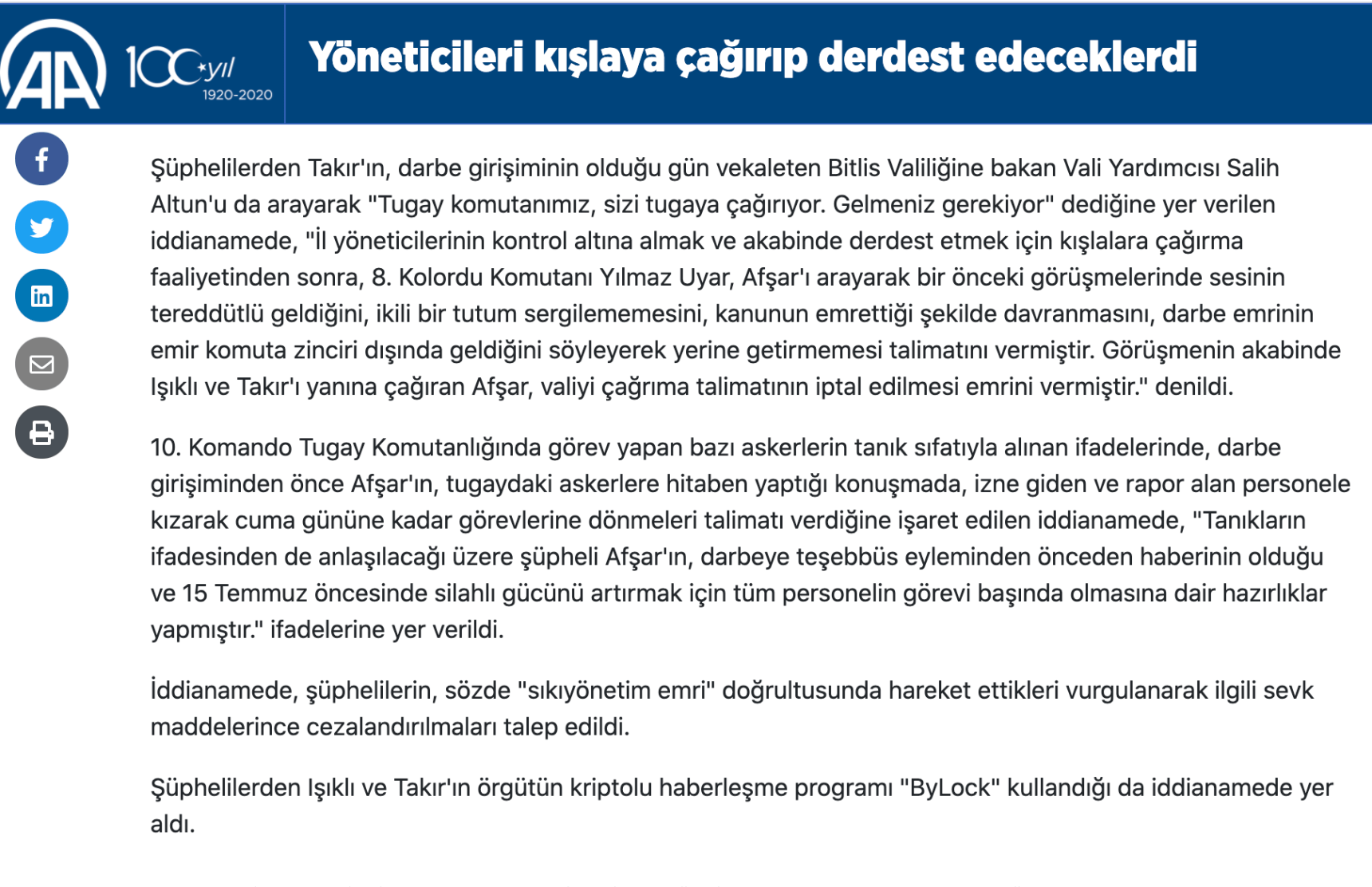 “Bitlis Cumhuriyet Başsavcılığı tarafından FETÖ’nün Bitlis darbe ana davası iddianamesinde ” Şüphelilerden Takır’ın, darbe girişiminin olduğu gün vekaleten Bitlis Valiliğine bakan Vali Yardımcısı Salih Altun’u da arayarak “Tugay komutanımız, sizi tugaya çağırıyor. Gelmeniz gerekiyor” dediğine yer verilen iddianamede, “İl yöneticilerinin kontrol altına almak ve akabinde derdest etmek için kışlalara çağırma faaliyetinden sonra, 8. Kolordu Komutanı Yılmaz Uyar, Afşar’ı arayarak bir önceki görüşmelerinde sesinin tereddütlü geldiğini, ikili bir tutum sergilememesini, kanunun emrettiği şekilde davranmasını, darbe emrinin emir komuta zinciri dışında geldiğini söyleyerek yerine getirmemesi talimatını vermiştir. Görüşmenin akabinde Işıklı ve Takır’ı yanına çağıran Afşar, valiyi çağrıma talimatının iptal edilmesi emrini vermiştir.” denildi.”