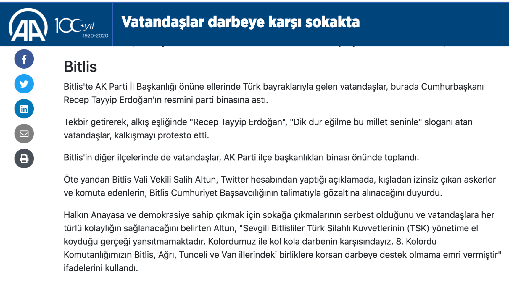 “Bu arada Bitlis Vali Yardımcısı Salih Altun, twitter hesabında halkın anayasa ve demokrasiye sahip çıkmak için sokağa çıkmalarının serbest olduğunu ve vatandaşlara her türlü kolaylığın sağlanacağını belirtirken, izinsiz olarak kışlasından çıkan askerler ve komuta edenlerin de Bitlis Cumhuriyet Başsavcılığı talimatı ile gözaltına alınacaklarını belirtti. Vali Yardımcısı Altun, ayrıca TSK’nın yönetime el koyduğunun gerçeği yansıtmadığını Kolordu Komutanlığı ile kol kola darbenin karşısında oldukların belirtti. Altun 8. Kolordu Komutanlığı’nın Bitlis, Ağrı, Bingöl, Tunceli ve Van illerindeki birliklere de korsan darbe ye destek vermeme emri vermiştir diye yazdı.”